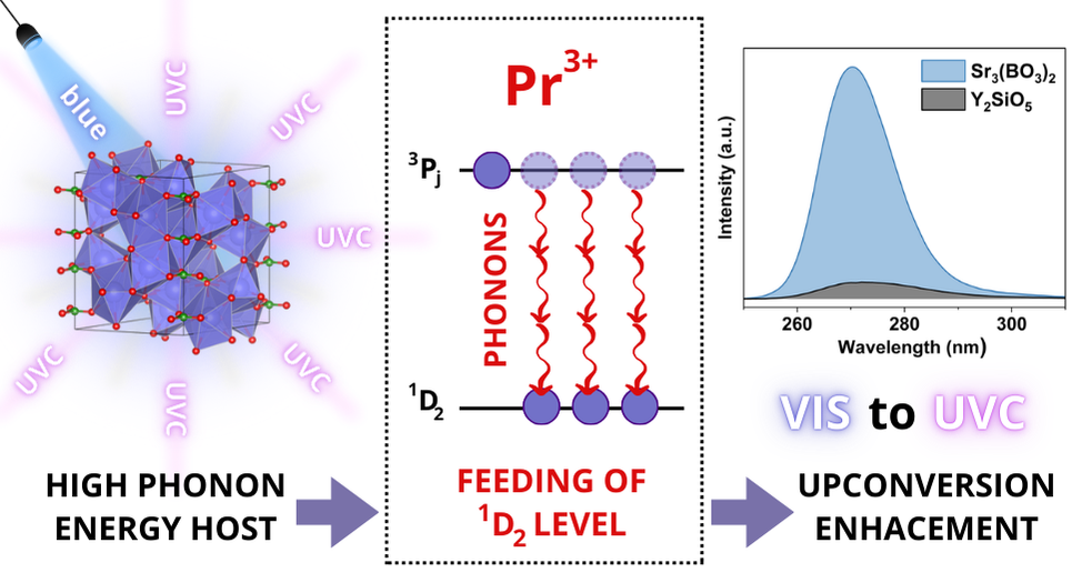 The recent pandemic has intensified the search for new ultraviolet C (UVC) phosphors excited by low-intensity visible light that can be used for disinfection or therapeutic purposes. Currently, the most promising phosphor with efficient upconversion was thus far Y2SiO5 (YSO) doped with Pr3+. However, we have studied a new material Sr3(BO3)2:Pr3+ (SBO), whose upconversion emission is 10 times stronger than YSO, despite the high phonon energy possessed by SBO and despite the lack of optimization of synthesis and dopant concentration and the absence of co-dopant that should be added to compensate for the charge. Such an efficient upconversion is achieved by engagement of the 1D2 level, which is populated by both the multiphonon non-radiative transition and the closed feedback loop. From this level, blue excitation can reach the 4f15d1 electronic configuration. At the same time, due to a small Stokes shift, the 5d levels emit exclusively in the UVC and partially in the ultraviolet B (UVB) region.